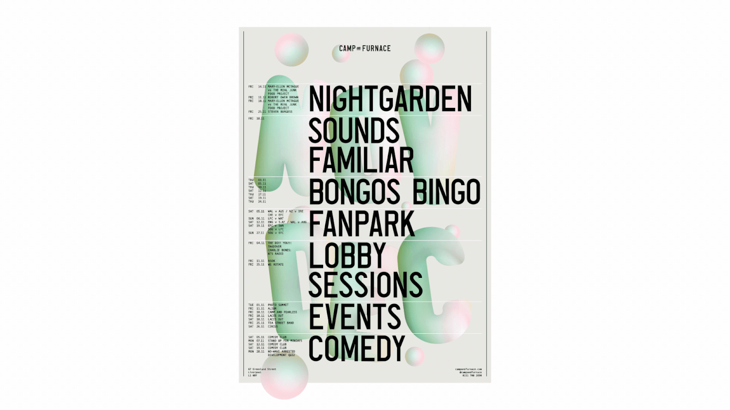 Camp & Furnace was a venue built to transform – an industrial canvas where caravans, food, music and spectacle could be rearranged at will. Our brand gave that flexibility a clear identity and voice, rooted in the idea of the great indoors: wood fires, festival cues and a deliberate outdoorsy energy brought inside. The result became a cultural shorthand for scale, spontaneity and creative independence in the Baltic Triangle.