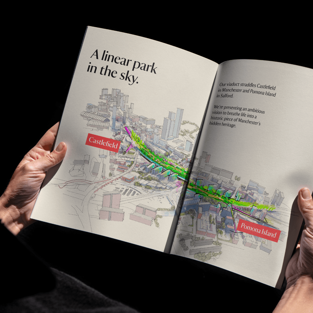 Working with Deco Publique, BDP and Smiling Wolf's proposal for the re-imagined use of the Castlefield Viaduct presents an ambitious vision to breathe life into a historic piece of Manchester’s hidden heritage. Connecting people and places, the foundation of the Vision was built upon creating a rich experience and strong identity to communicate the core ideas to a wider audience.
