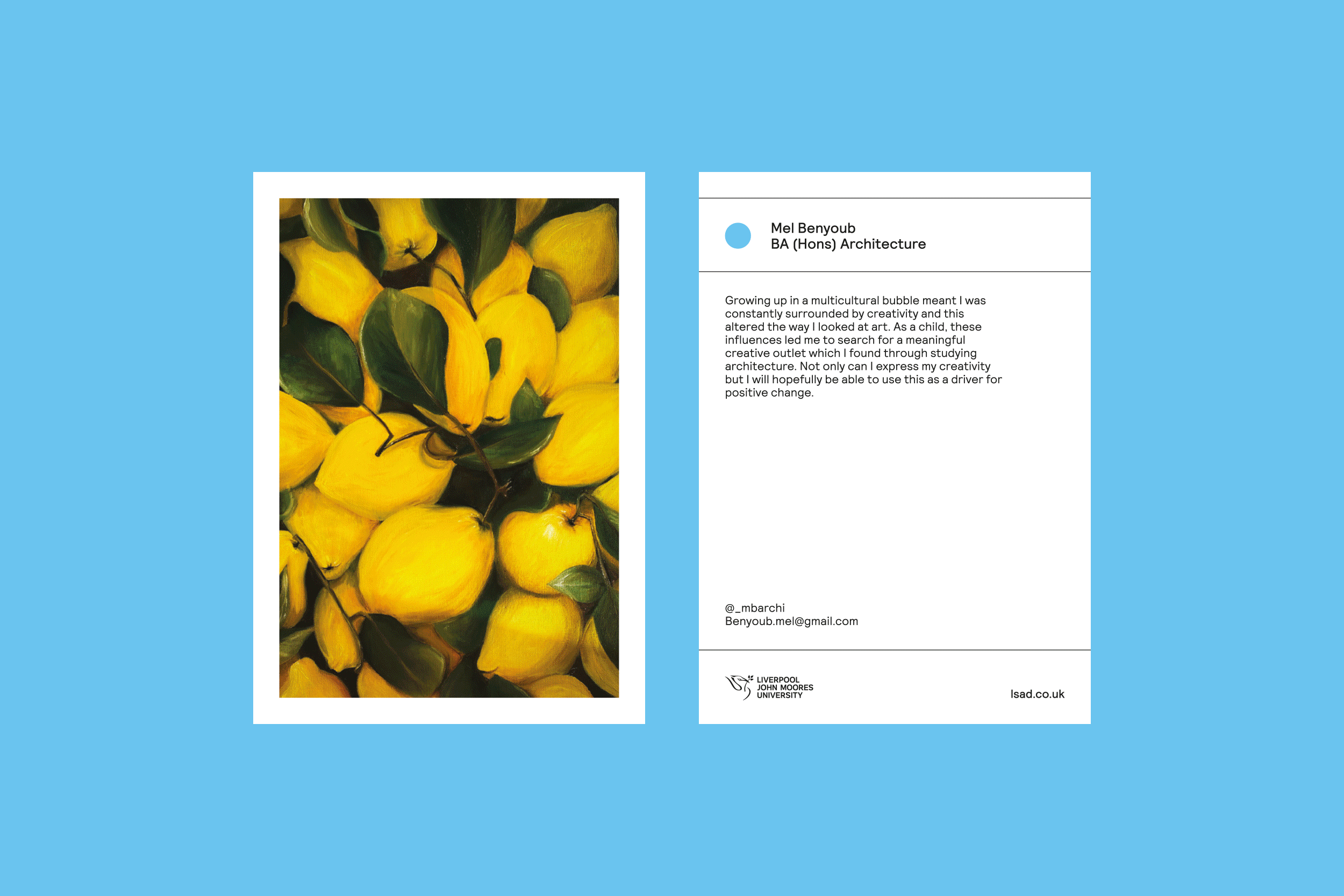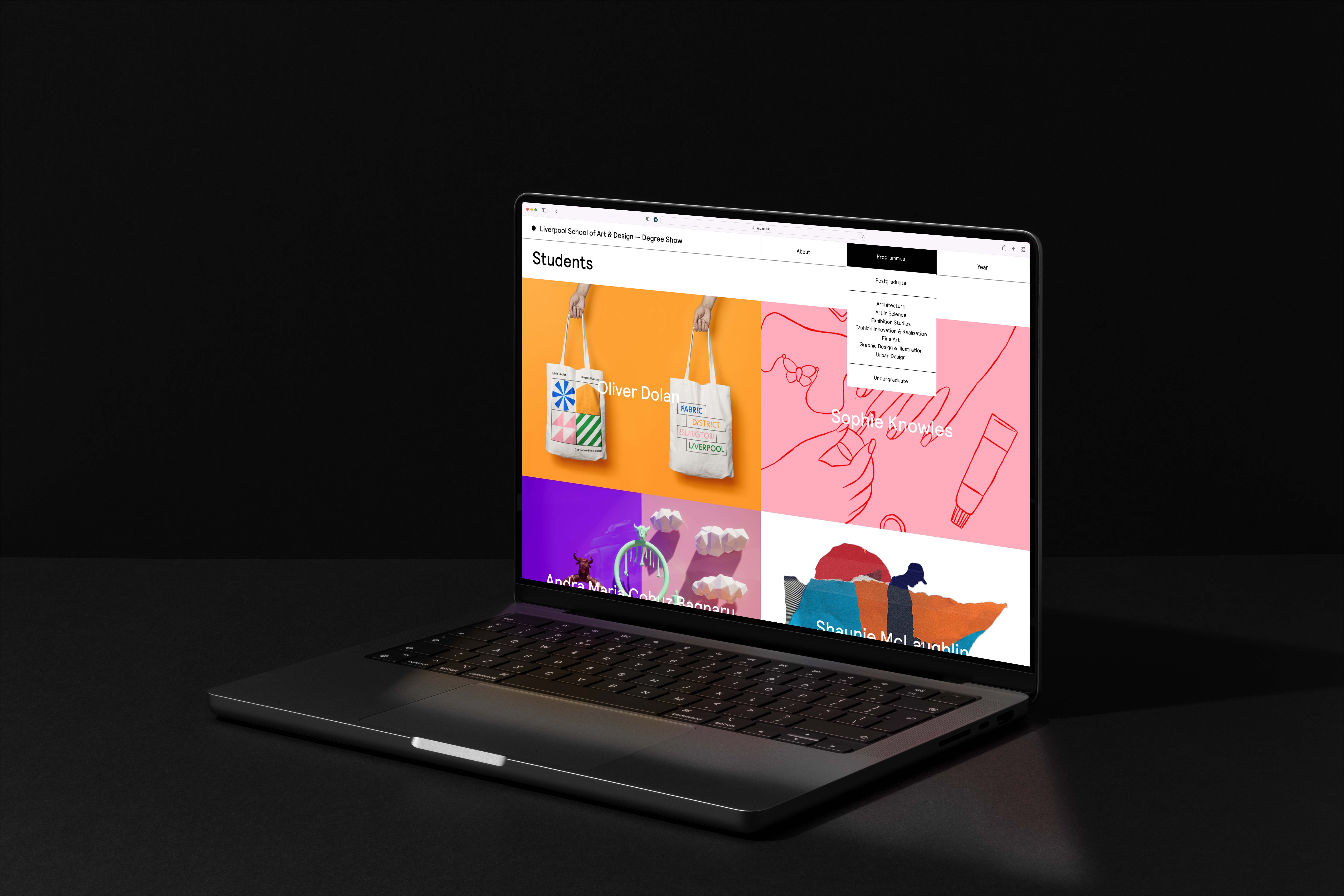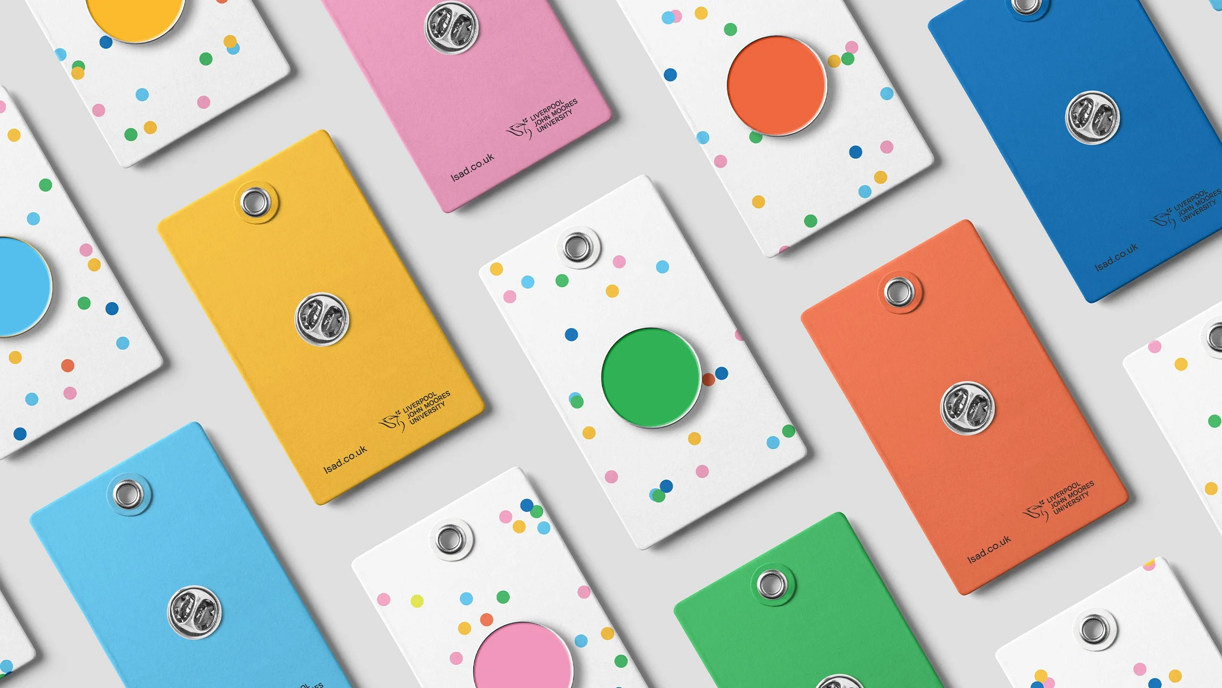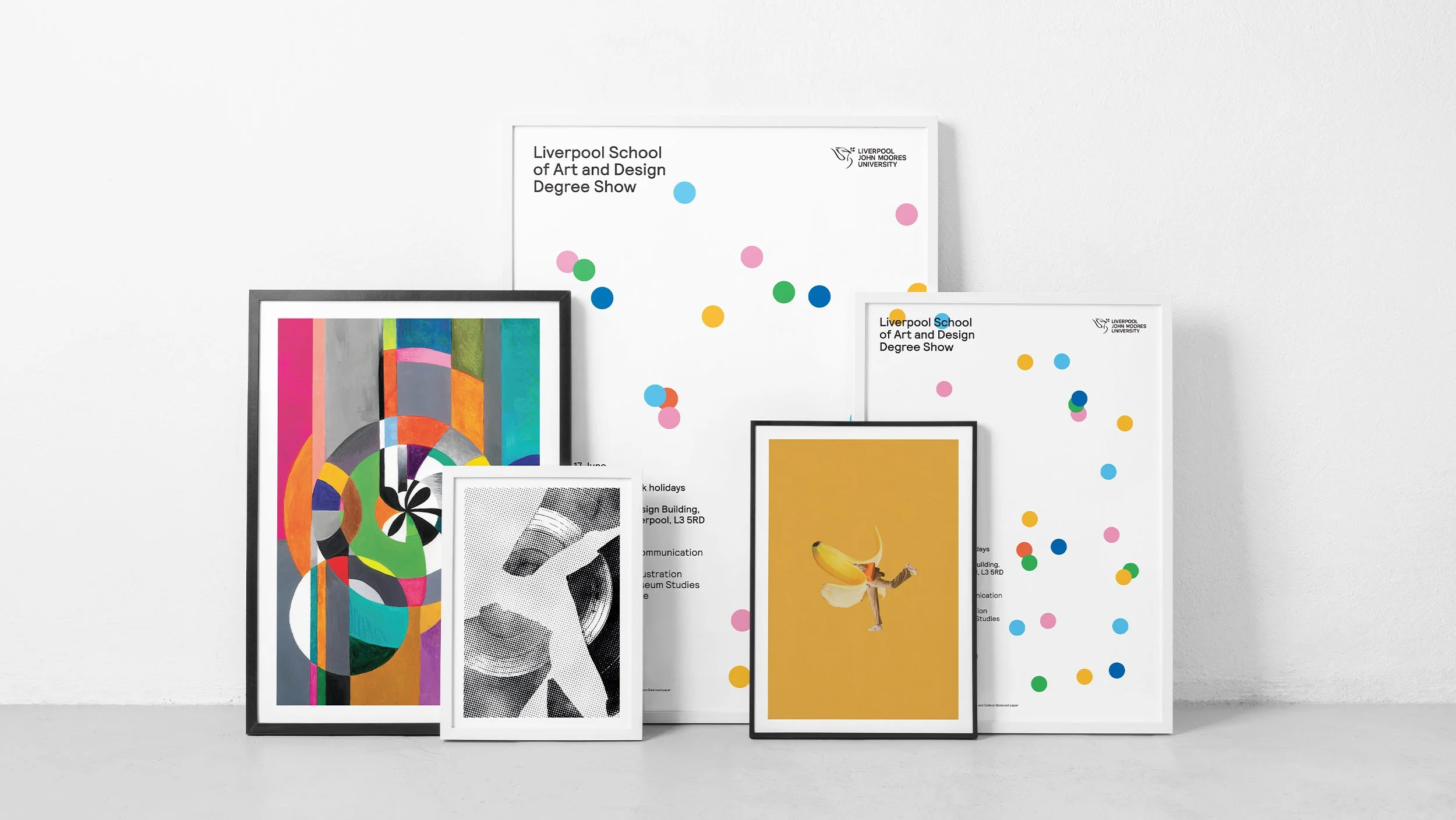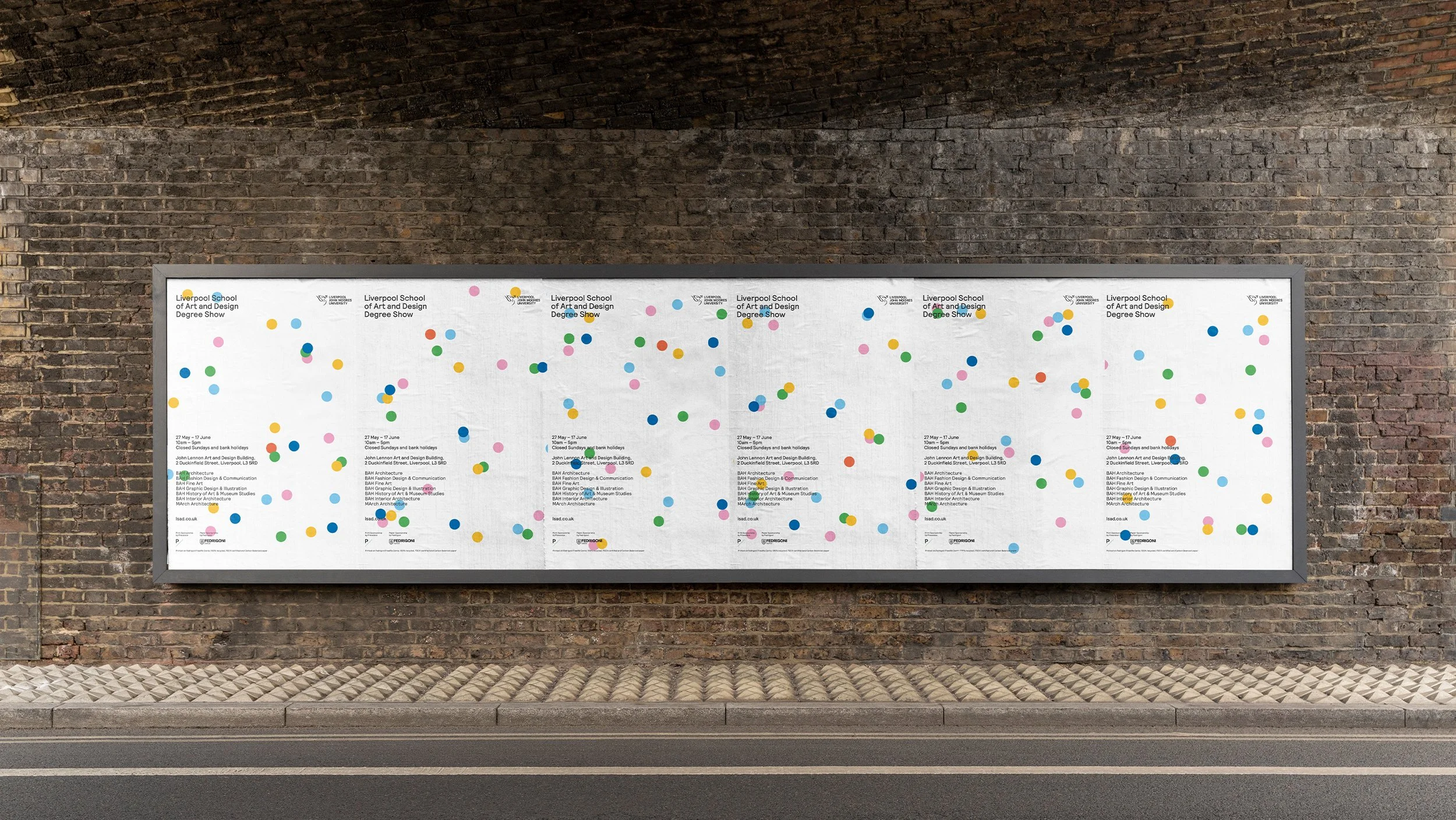 The identity created for Liverpool School of Art and Design 2022 Degree show was about celebrating belonging and togetherness. After not being able to be in the building during the pandemic, there was a desire to celebrate being together again. Each graduating student was represented by a dot, with the colour reflecting their chosen specialism. Clustering, connecting and exploring their space of craft and development in a celebratory fashion. Using an algorithm we were able to generate never-ending variations of the dots, meaning each piece of print was unique.