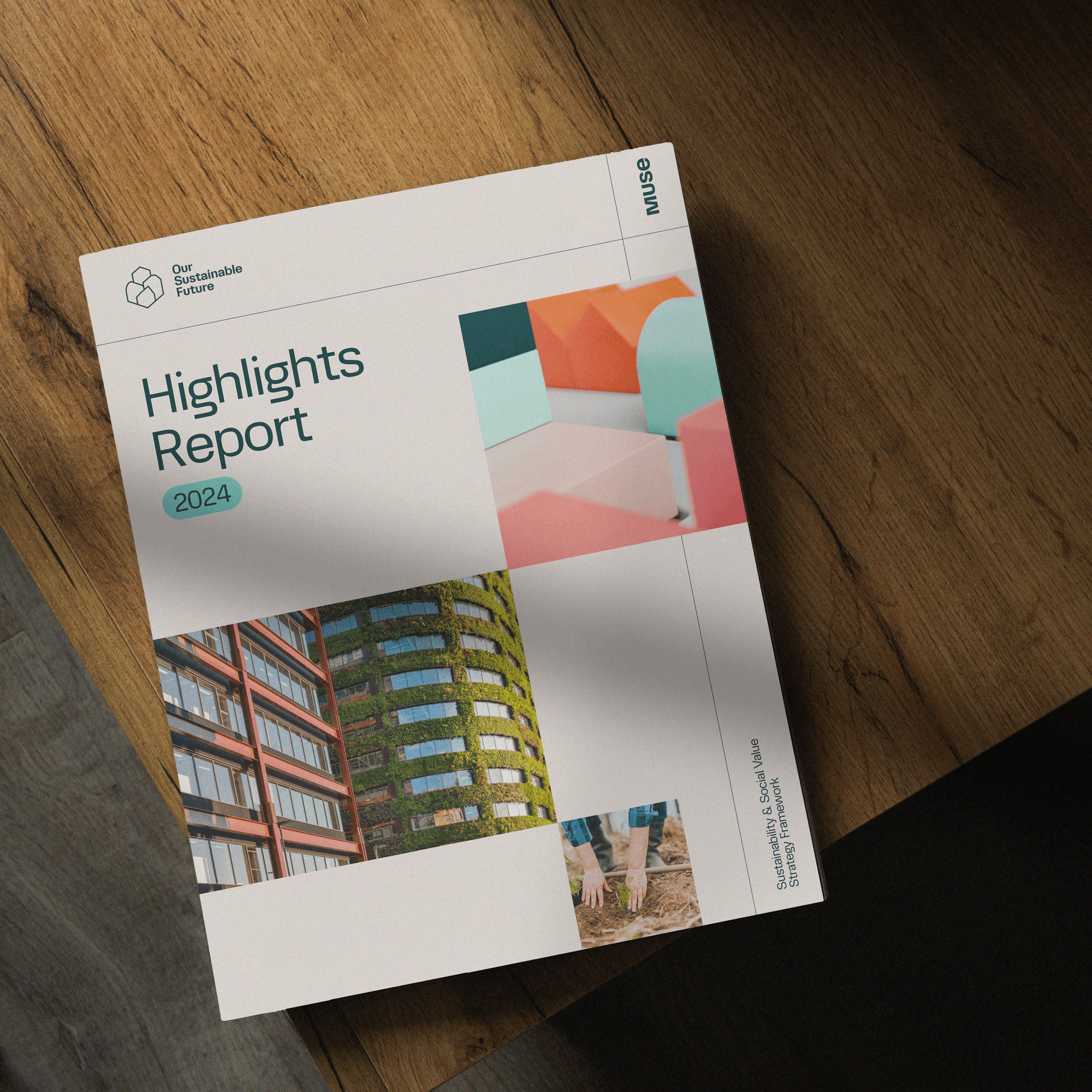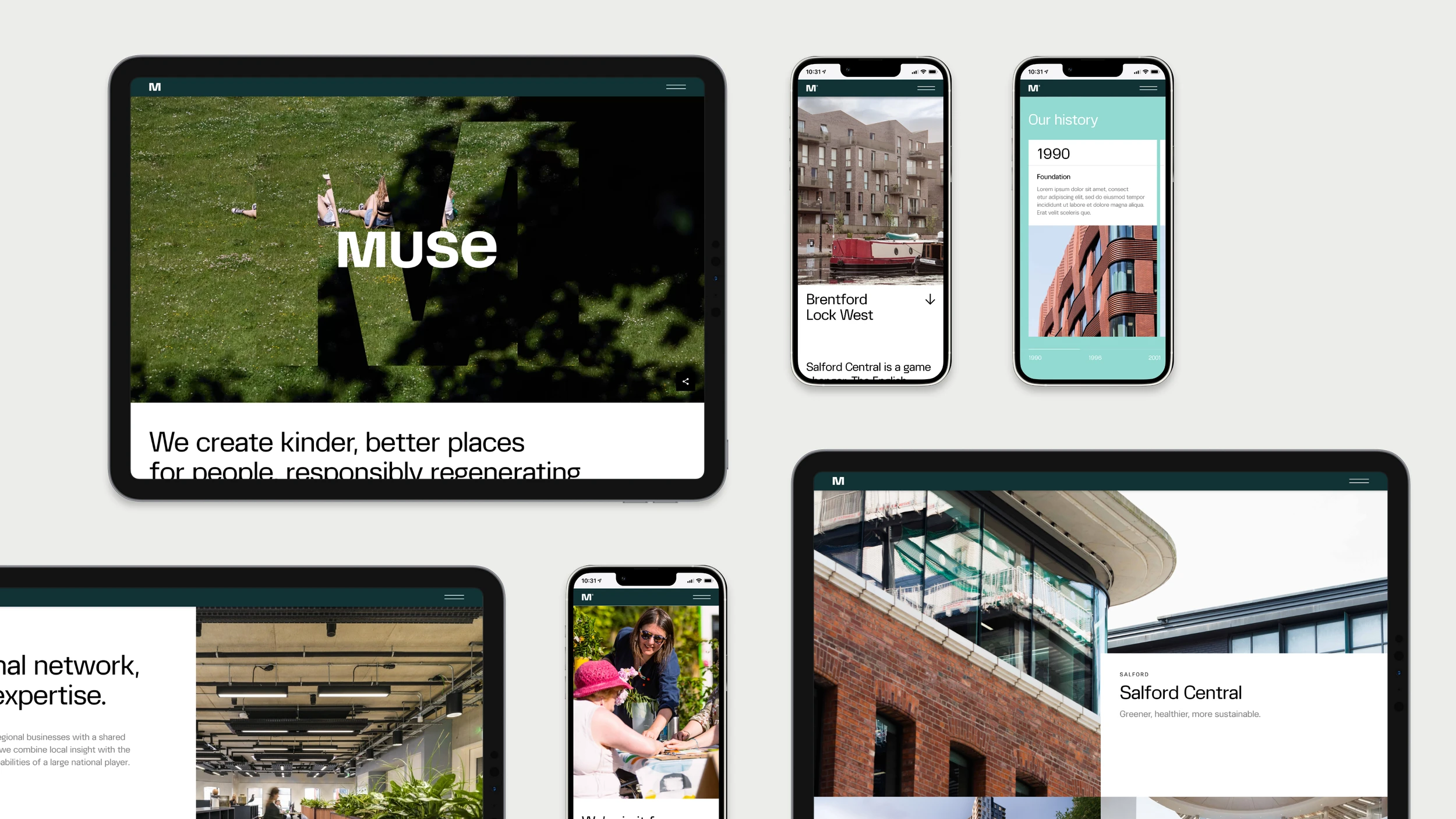 We extended the Muse brand by creating a sub-brand for their sustainability initiative, along with a series of place brands for their developments. Each one has its own character and purpose, but all sit within the shared design language and framework we developed for Muse. This ensures every part of the brand family feels connected, consistent and aligned with the core identity.