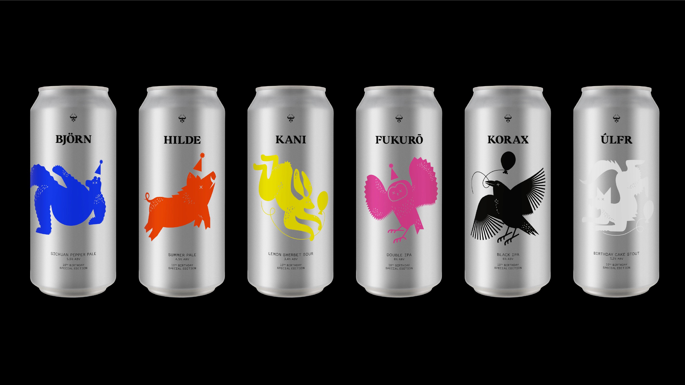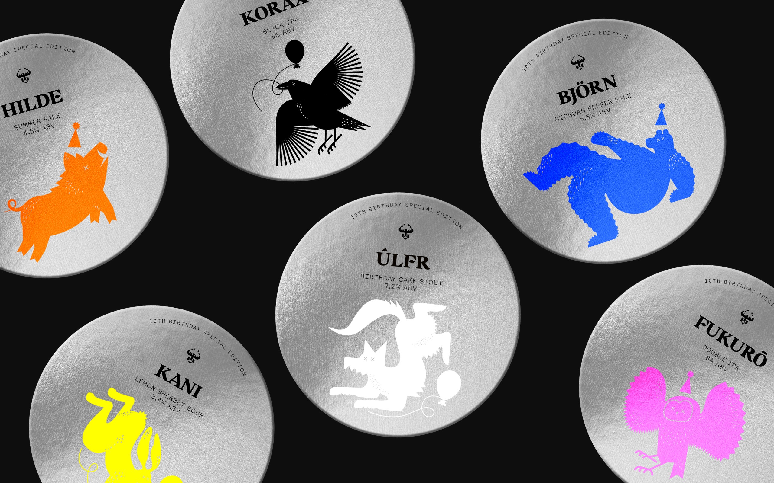 For Black Lodge's tenth anniversary we developed a series of characters – six beers to celebrate ten years. Party Animals features a series of fun-lovin' beasts across packaging, posters and merchandise; Björn, Kani, Hilde, Korax, Fukurō and Úlfr are here to have a good time and mark a signficant milestone in the brewery's development.